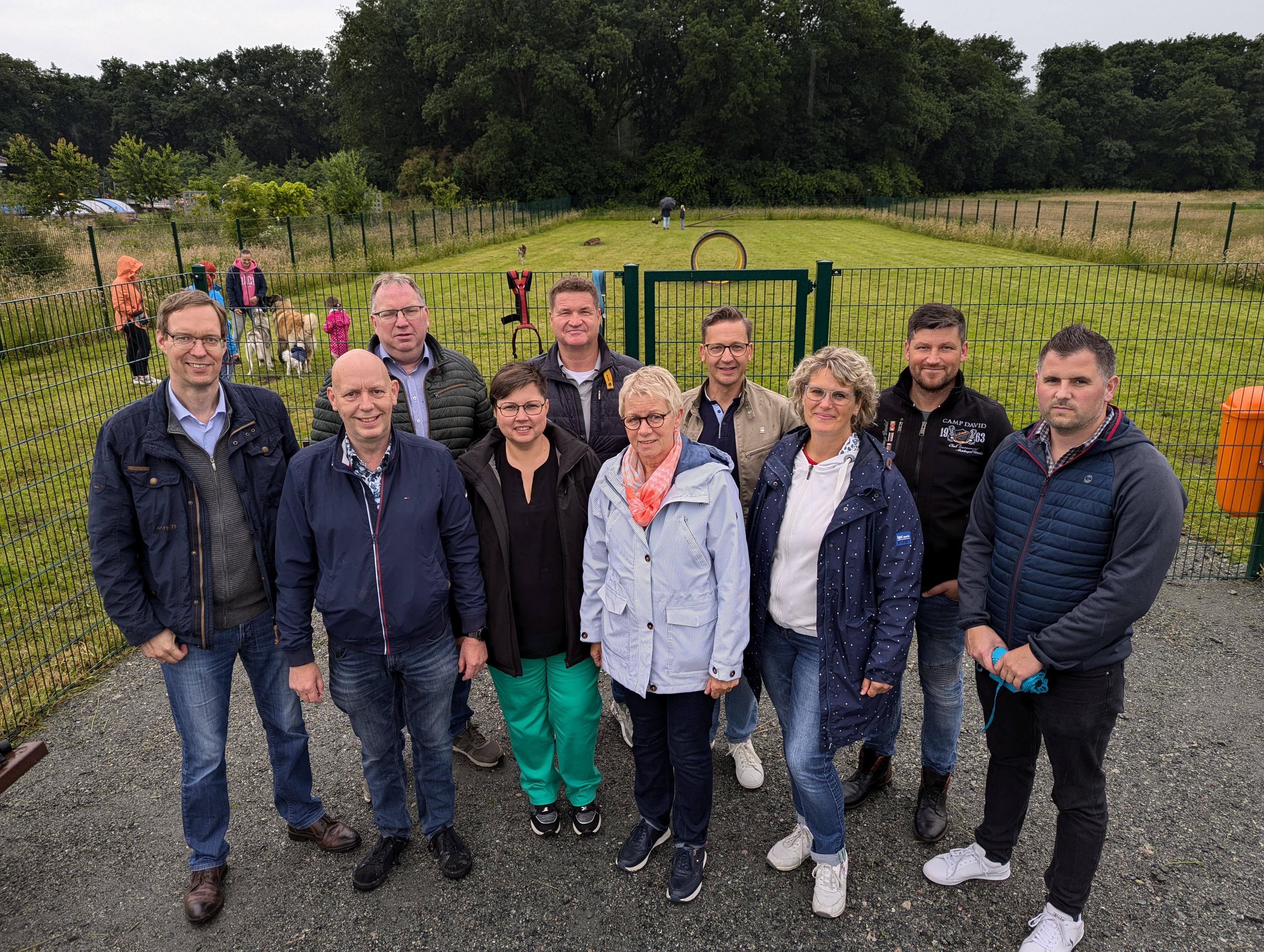 Vertreter aus Gemeinderat und Verwaltung bei der Eröffnung des Hundeplatzes. Im Hintergrund erkennt man wie bereits einige Halter mit ihren Vierbeinern aktiv sind. (Foto: Daniel Mäß)