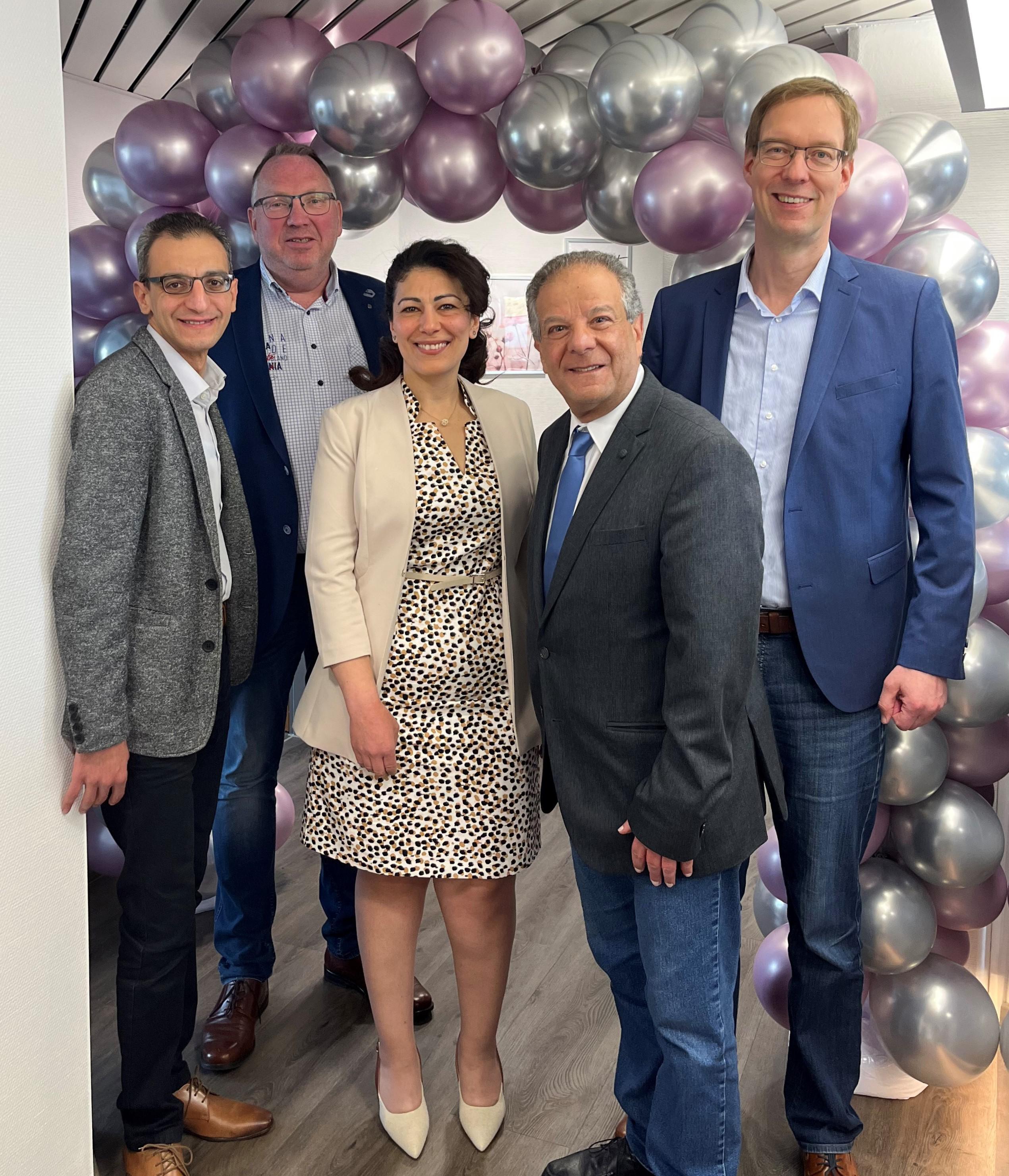 Ehemann Tharwat Mikhiel (von links), Bürgermeister Manfred Gerdes, Dr. Medhat Nakhlah und Gemeindedirektor Hermann Wocken gratulieren Mariam Ghobrial zur Eröffnung ihrer hausärztlichen Praxis. (Foto: Gemeinde Dörpen)