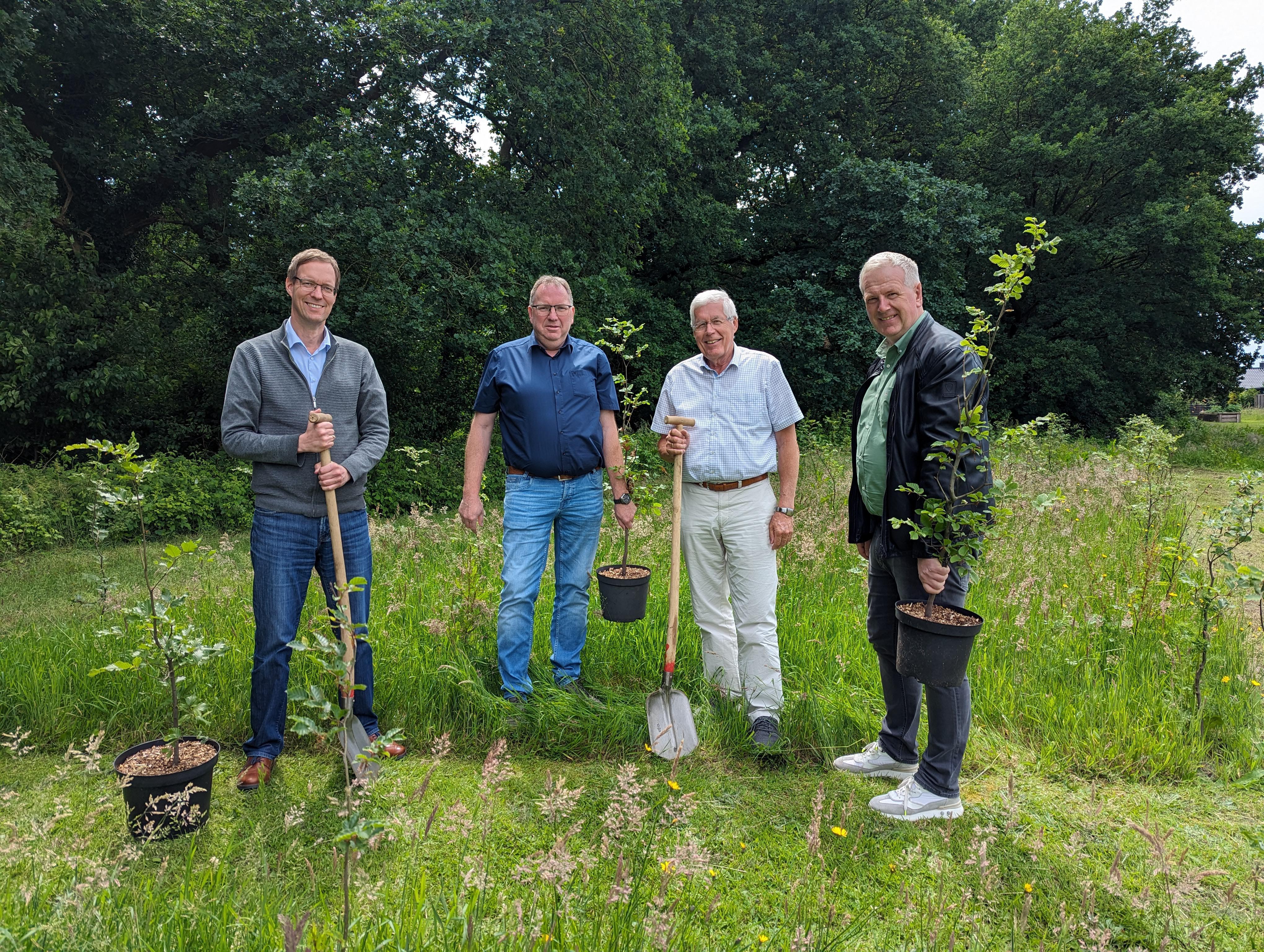 Gemeindedirektor Hermann Wocken (von links), Bürgermeister Manfred Gerdes, Wilhelm Schomaker sowie Kämmerer und Wirtschaftsförderer Heinz-Hermann Lager zwischen den frisch angepflanzten Bäumen. (Foto: Daniel Mäß)